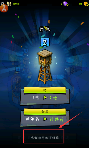 1、点击任意地方继续,确认枪械和仓库的升级选项。