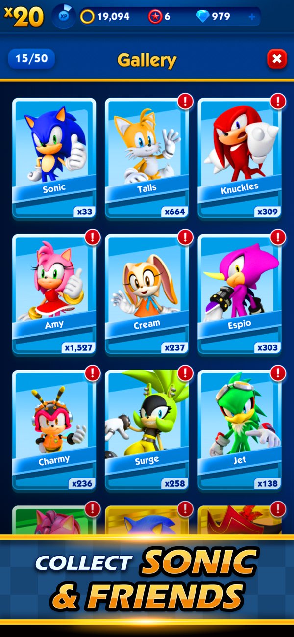与索尼克共同奔跑,奖励越跑越多!解锁更多角色,如:塔尔斯、纳克鲁斯和夏特!与索尼克一同无尽跑酷,乐趣不分年龄!