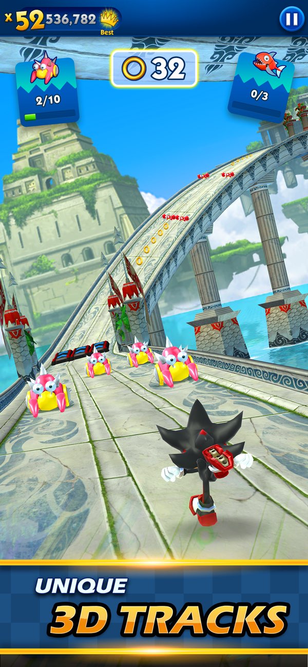 与索尼克的伙伴们同行,扮演塔尔斯、夏特和纳克鲁斯等超赞索尼克英雄。选择心仪角色,在这款超快无尽跑酷游戏中大展神速。喜欢经典索尼克和经典SEGA游戏的你,绝对会爱上《Sonic Dash》!