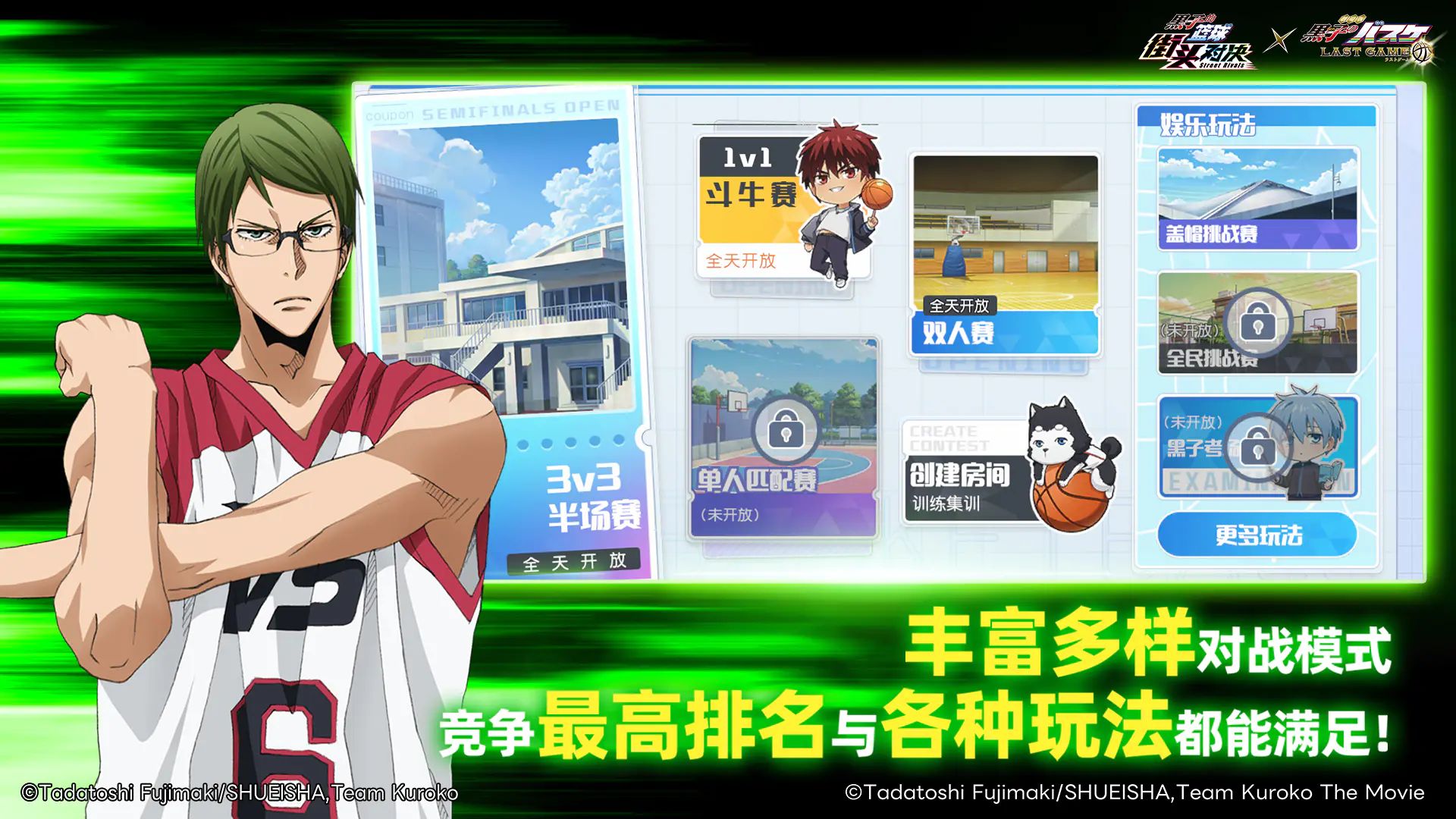黑子的篮球街头对决是一款篮球竞技多人对战手游,改编自日本人气篮球动漫《黑子的篮球》,忠实呈现原作的世界,黑子哲也、火神大我、青峰大辉、赤司征十郎等人气角色均可由你来培养,重温诚凛高校的热血篮球征程。游戏采用3V3多人在线实时对抗,玩家将通过指尖操控角色走位、传球、突破、灌篮,重现动画中的战术博弈,感兴趣的话就赶快来下载试试吧!