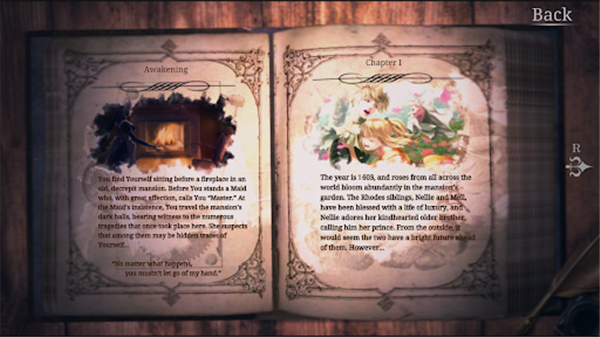 《海市蜃楼之馆》(The House in Fata Morgana)是一款哥特风格的文字冒险AVG游戏。玩家将成为一个在西洋风豪宅中醒来的失忆少女,不知道自己是谁、为何在此地。一位神秘的女仆将指引玩家探索关于这栋豪宅的回忆,共有四段凄美动人的故事,每个故事都讲述了关于爱、希望、背叛、绝望的故事。游戏中,玩家的选择至关重要,将导向不同的结局分支。游戏语言为哥特风格的华丽书面的翻译腔。