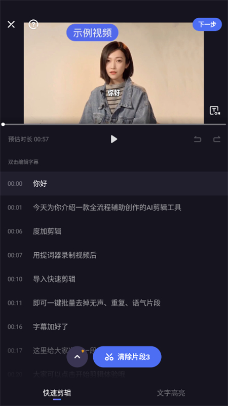 3、选择好视频后就可以开始剪辑,大家可以根据需求进行分割、删除、变速、画中画等操作,也可以点击快速剪辑,帮您快速完成剪辑