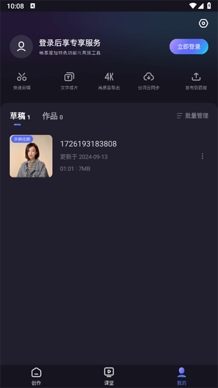 授权后支持下载并导入网盘素材,降低您导入存量自定义素材的门槛。支持草稿云备份,实现随时随地剪辑。