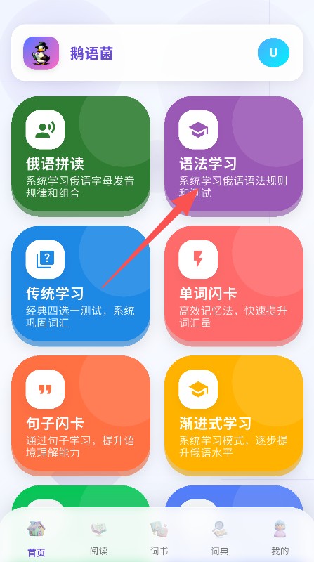 1、提供多维度俄语学习模块入口,涵盖俄语拼读、语法学习、单词闪卡等,满足不同学习需求。