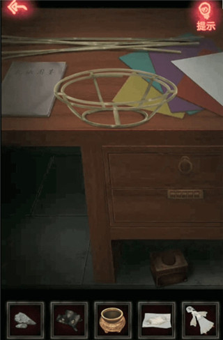 24、接着我们来到得到毛笔的桌上点击最下面的盒子,将两个小饰品一起放入进去,得到一把没有齿的钥匙。
