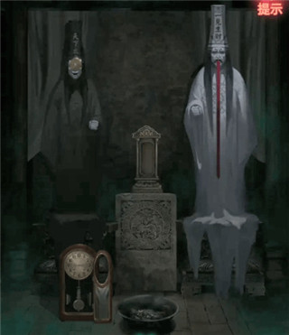 16、来到城隍庙左边的门,拿出令牌可以得到提示,这个提示是城隍庙右边时钟的提示,如图调整时钟,如图调整,打开得到符纸人,继续按照之前步骤将符纸人放在中间案台上,接着点击中间的画进行写状子。