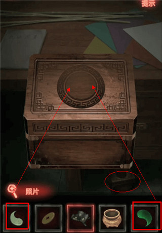 9、移步到右侧书架,第二层有个阴阳镇,按照灯笼上的提示打开,取到照片。