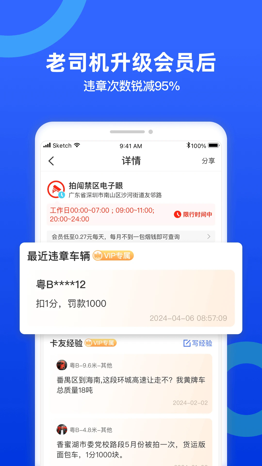 在地图上直观的展示目的地周围的所有限行、限高、限宽路段,并详细标注当地限行时间和限行规则。
