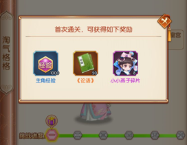 首通奖励:首次通关某一关卡,可在下方进度条上领取首次通关宝箱,宝箱内的物品为该章节对应的随从碎片,主角经验以及论语。