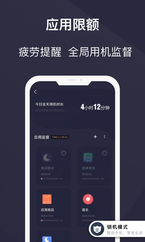 2、定时锁机:设置多时段定时锁机,定时自动开始,以免玩起手机忘记时间;