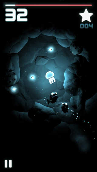 水母移动是肯定需要能量的,在上方有一条白色的线,这就是能量。这个能量会慢慢的减少,如果能量消耗完了的话,就游戏结束死了。想增加能量,有几个方法,那就是吃掉会发光的小鱼,如图所示。