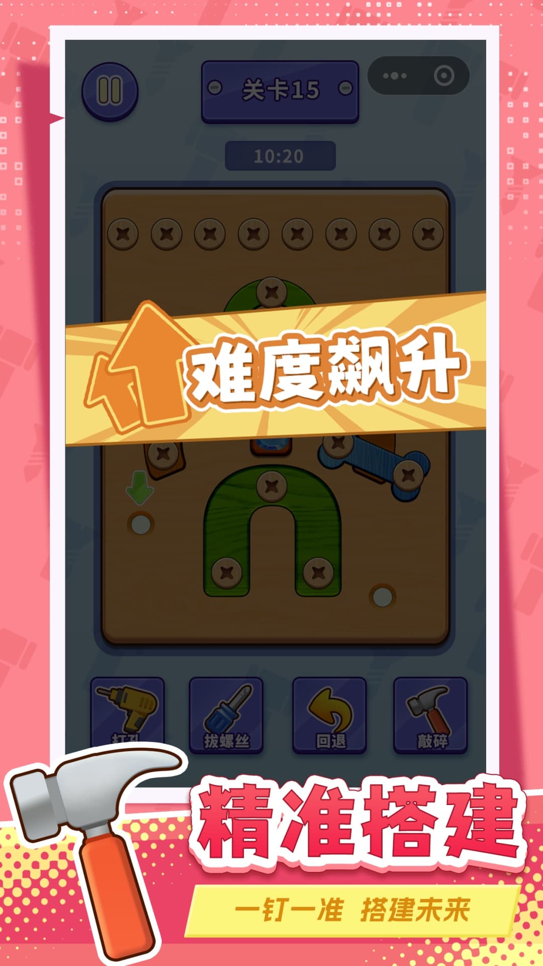 《打螺丝拧不住拔钉子》是一款好玩有趣的拔钉子类休闲益智游戏。游戏中,玩家们将化身一位位能工巧匠,面对一块块错综交杂在一起的木板,需要按一定顺序将把木板两端结合在一起的钉子敲下,以此来通过关卡。游戏中关卡颇多,且随着游戏进程关卡难度也会增加,但总体还是休闲益智的玩法。游戏操作也十分轻松,玩家只需要点击屏幕即可移开木板,十分解压。