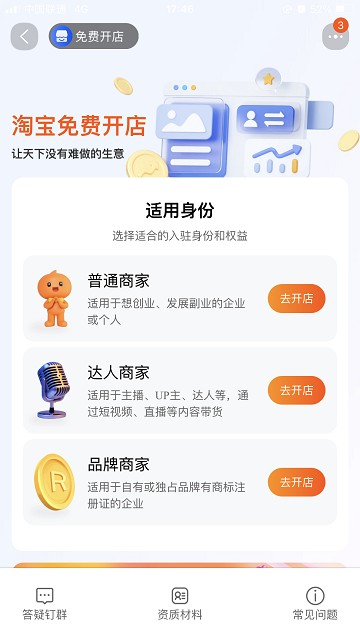 在淘宝官方网站顶部点击【免费开店】或手机淘宝搜索【开店】进入淘宝开店入口