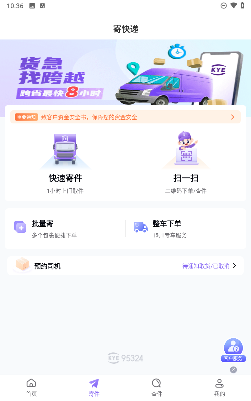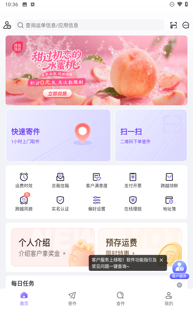 跨越速运是一款移动快递业务管理软件,为用户提供一站式快递运输服务。软件包括自助下单、订单管理、运费核算、服务查询、礼品兑换、活动推广等等服务,用户可在软甲内填写个人信息以及快递信息等资料自助下单,下单成功后快递员会到达指定地点,完成区间后用户可在手机端查看订单、物流等信息。跨城速递为用户提供超快时效,极速送达,限时未达,减免运费等服务,是一款不错的寄件软件。