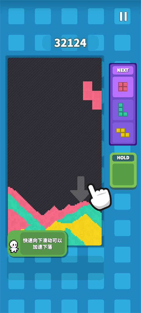 方块流沙是一款趣味休闲益智游戏,这款游戏将经典游戏俄罗斯方块与流沙元素结合,让方块流动起来,很有创意。游戏玩法采取俄罗斯方块的框架,流沙方块从屏幕顶部下落,玩家需要合理规划方块落点以消除凑成整排的流沙,请注意,流沙是会流动的,所有你需要根据原本的流沙堆形状,调整方块位置。流沙元素的加入增加了游戏的随机性与可玩度,你必须发挥想象力预测流沙的形状,非常有趣的一款游戏!