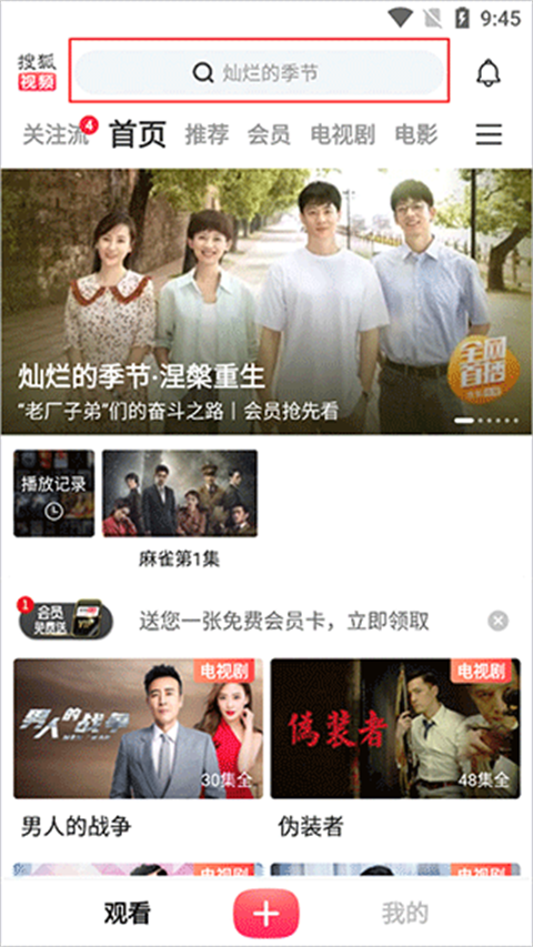 1、首先打开搜狐视频app,进入到首页,点击最上方的搜索框,找到你想看的视频。