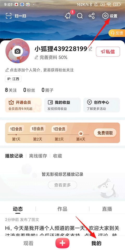 1、打开搜狐视频APP,点击【我的】-右上角的【设置】按钮。