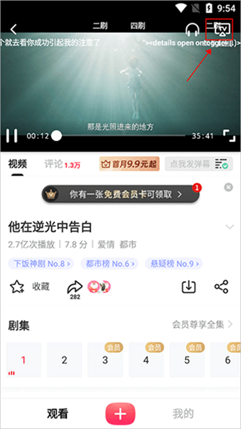 3、随后进入了播放界面,影片开始播放,这时我们可以看见,右上角有个TV的标志,我们点击即可, 如果有的是灰的,那可能是版权不支持。