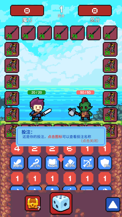 《摇奖勇者》是一款结合了Roguelike与策略类玩法的游戏。游戏中,玩家需要扮演一名勇者,通过摇奖的方式与敌人进行战斗。游戏中摇奖的概率十分随机,因此不知道下一步怎样的风险使游戏更加刺激。怪物每回合都会对玩家展开攻击,当玩家摇奖获得的分数超过怪物生命值时,游戏即为胜利。同时,玩家还可以通过各种方式来提升摇奖概率,十分好玩有趣。