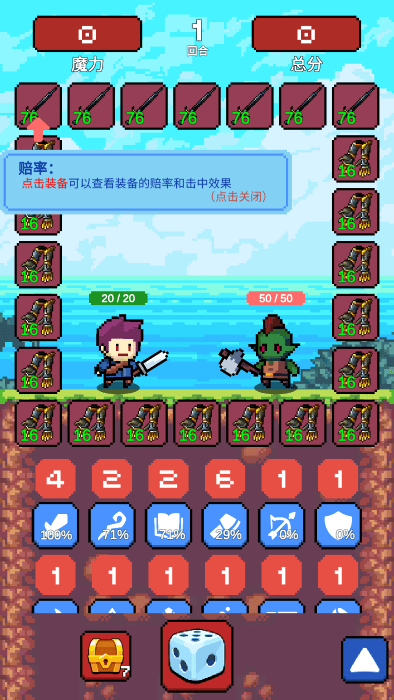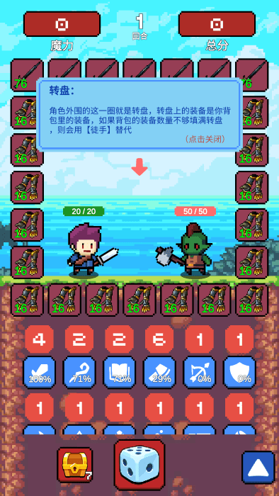 2、当转盘停止后,会获取相应的装备,同时获得该装备的分数,累计分数大于敌人的生命值时,则击败敌人获得胜利,同理敌人每回合也会进行攻击,消耗你的生命值。