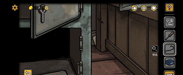 我们回到最初待着的房间,点击大门,用钳子剪断连着的地方,出门后在左边门的下方取得铁丝。