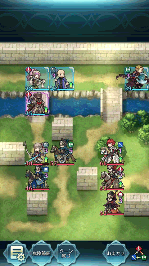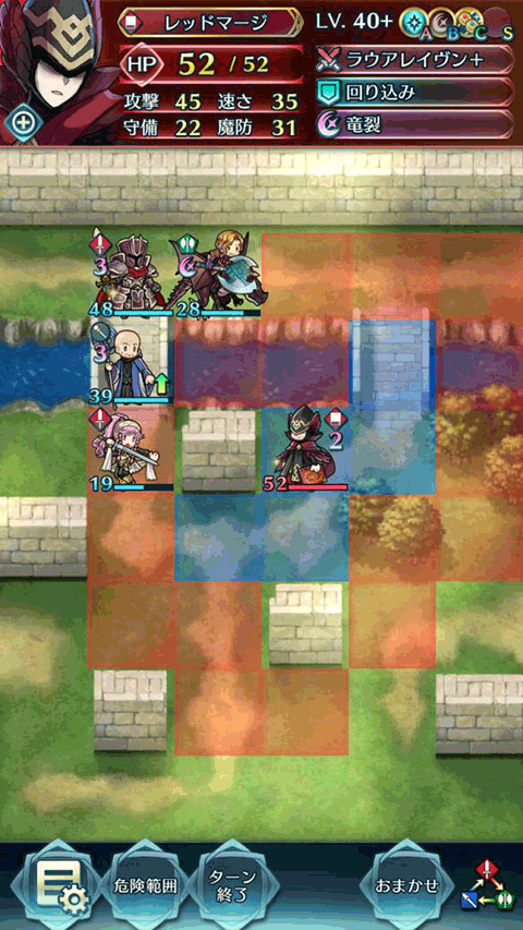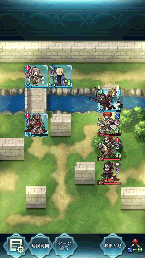 纳西恩飞到墙角卖表情包。剩下三人如图站位。敌方回合,骑法会被+4攻的小黑反死,拓海先动。小黑反不死拓海,左边三人就围成一团,下一回合处理。