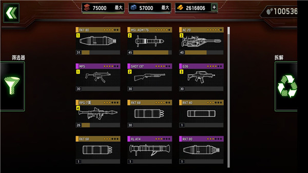 2、在战斗闯关模式中,每一关都设定了关卡的难度分级,在开始任务前,玩家可以在装载中选择战斗中所使用的武器,点击可进行筛选,最多只能带三样武器,需要按等级解锁,点击前往部队可查看地面部队类型以及装载的武器。