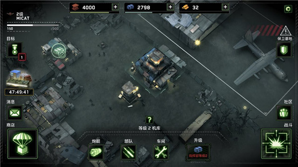 3、开始任务后,需要先设置部队部署位置,红圈内为高塔区,不能部署此处,建议观察可掠夺资源的周边建筑,计算每个障碍物的离资源点的距离,以及任务目标要求是什么,尽量完成目标以获取更多的资源,当然任务在前期都很好胜任,获得的宝箱可以开出5.56毫米机枪、MP5冲锋枪或是火炮等装备,以及等级经验,点击战队图标可查看全部武器以及设施,红色代表未获得。