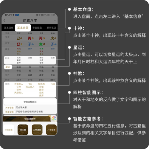 3、拆解《穷通宝鉴》、《滴天髓》、《三命通会》、《八字提要》、《神峰通考》等名著的经典论述,智能匹配每个八字,让您不用翻书也能读懂八字!