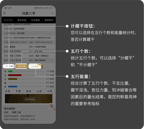 除此之外,智能五行分析模块对命盘的五行能量做了定量的分析,这就是我个的“五行个数”和“五行能量”功能