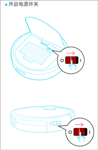 1、首先将扫地机器人主机的上面板向上掀开,打开电源开关,由O拨到I。