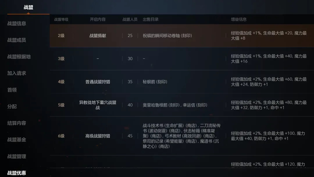 提升战盟等级后,所有的战盟成员会获得额外的属性加成!而且战盟等级越高,加成属性越高。