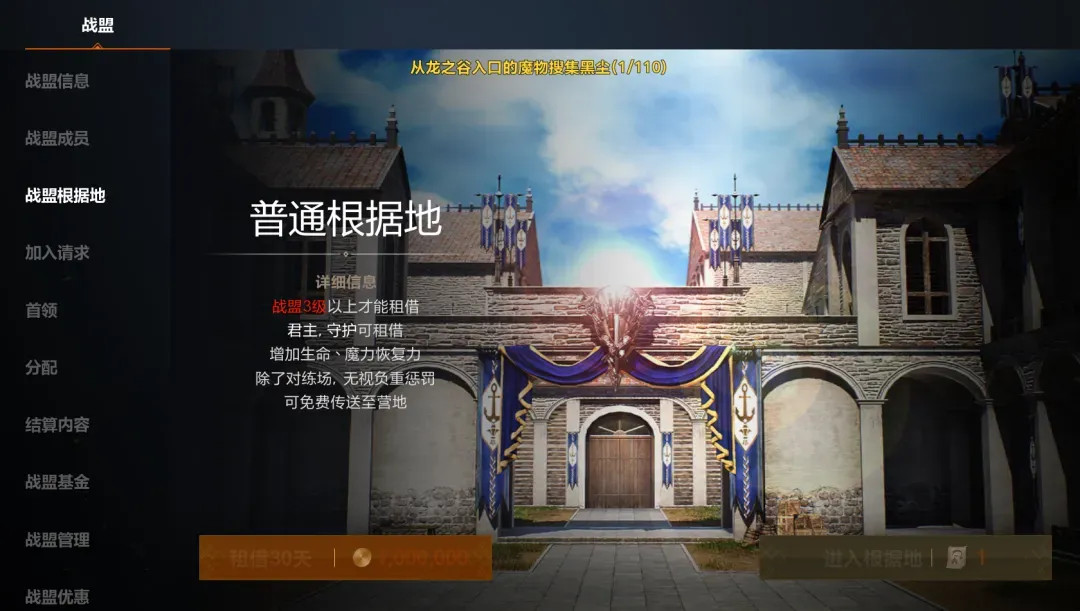 战盟等级达到3级后,战盟的君主以及守护者有资格购买战盟根据地!在战盟根据地中,成员回复生命以及魔力的速度更快哦~