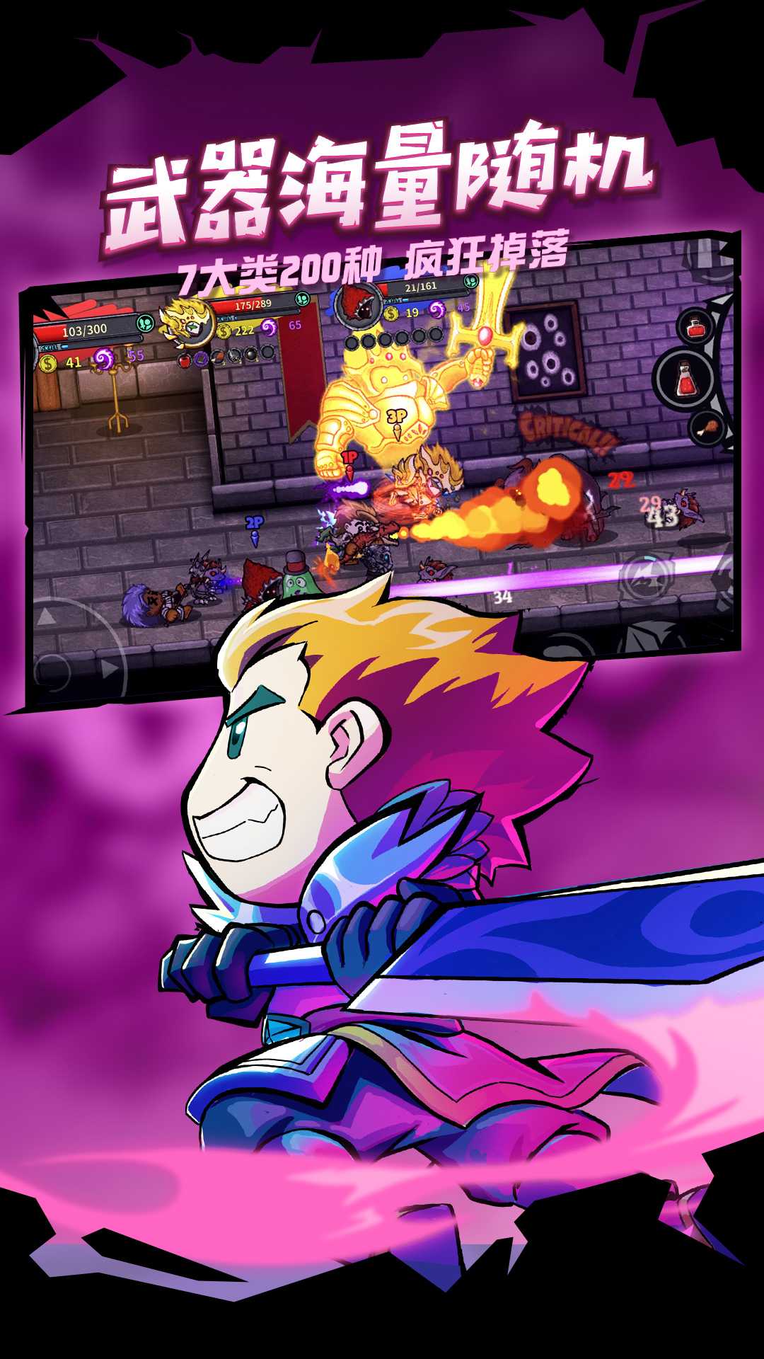 3、武器海量随机:7大类200种疯狂掉落,每把武器都拥有各自位移动作与攻击技能。