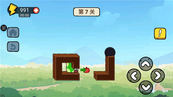 这一关开始有点难度了,先向右,但是不要看到苹果就直接吃,而是先来到右边,然后向上拐,再向左吃到苹果,从左边绕出来,爬上去,从上方抵达终点;