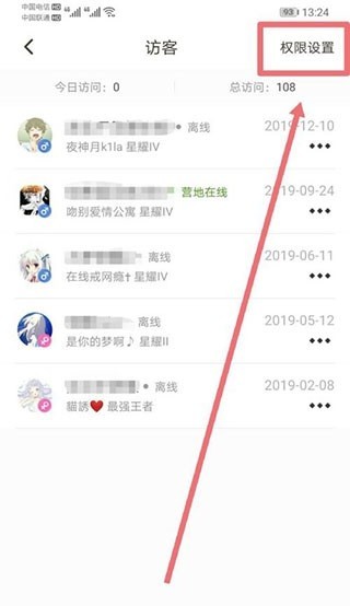 3、这时在“访客”页面可以看到所有访问过自己的好友,点击右上角的“权限设置”;