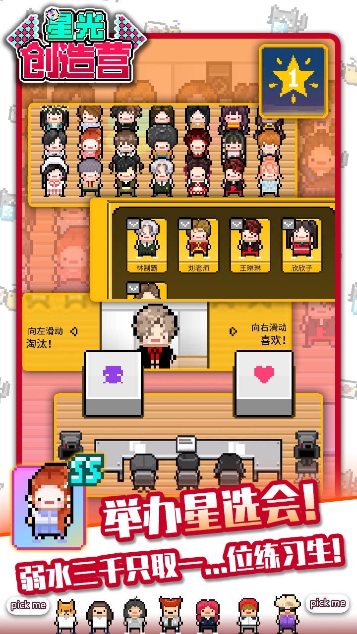 星光创造营一款像素风格模拟经营养成类手游,玩家将在游戏中运营一家偶像经纪公司,提供招募练习生、签署合约、属性培养、拍摄剧本、舞台演出等等方式,打造一家全球顶尖的经纪公司。游戏内有多种招募练习生的方式,如海选、街头星探以及扭蛋招募等等,寻找有潜力的练习生并改造他们,这里还有上百种服装、配饰,帮助你打造星光熠熠的偶像团体。这款游戏以偶像打造为主题,还有诸多与娱乐相关的玩法等待你的探索!