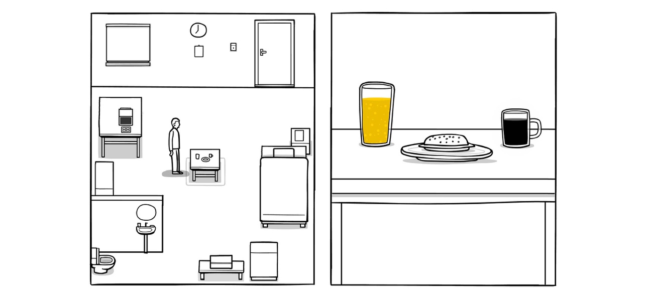 6、测试结束之后会推进来一个推车,也就是我们的晚餐,吃完之后来到柜子旁边(也就是之前打开的抽屉旁边)开始娱乐活动,点击哑铃举10下。