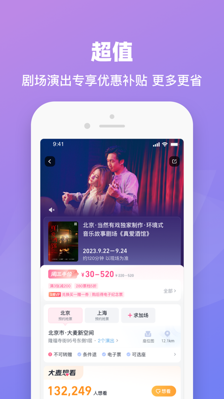 1、全新上线「现场」频道,麦小编每天更新演出资讯,为热爱现场的你精编各类养眼专栏,你要的潮、燥、闹、静、有态度的娱乐生活,只需一个大麦APP!