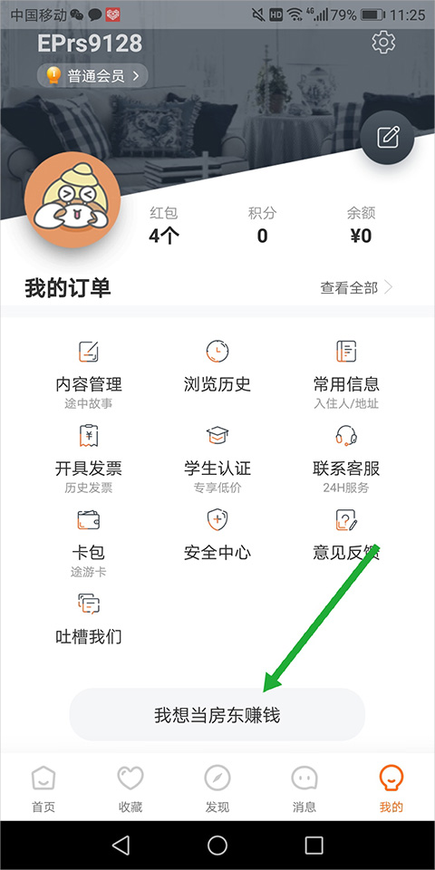 发布房源流程简单,房东只需进入【我的】页面点击底部【我想当房东赚钱】按钮(下图绿色箭头处)