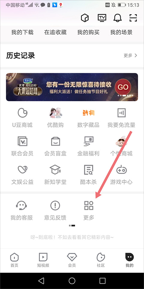 1、用户打开并登录优酷app后进入【我的】页面中点击【更多】