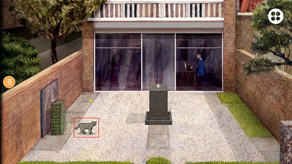 6、最后点击喷泉上的【猫】,女人把猫抱到围墙上,本章节通关。