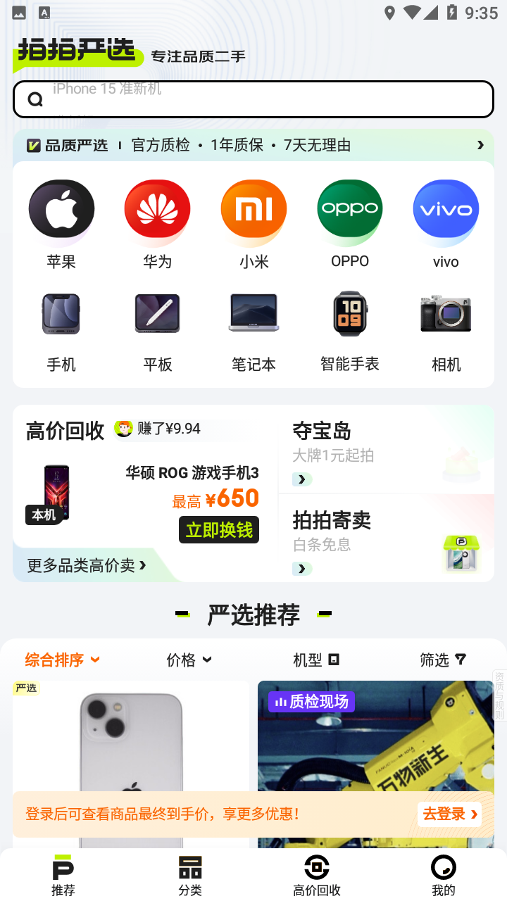 1、进入京东拍拍严选app,选择下方“高价回收”选项