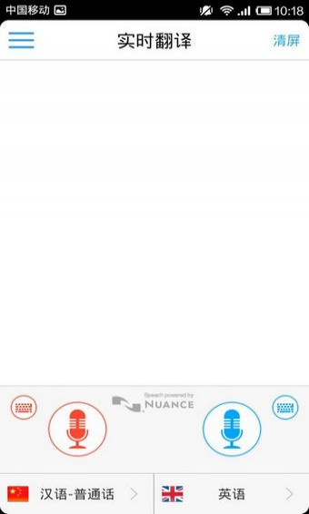 1、进入首页后,是一个很简单的页面,下面两个麦,上面就是记录屏,麦下方能选择你使用什么语言,右边是翻译的语言,其实这两个功能有点重复。