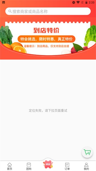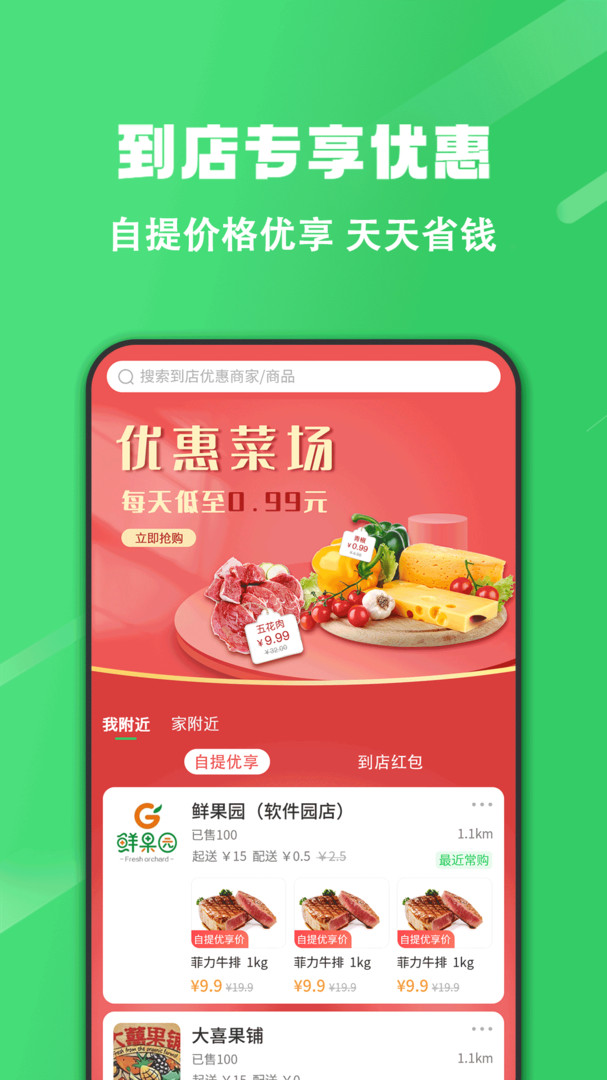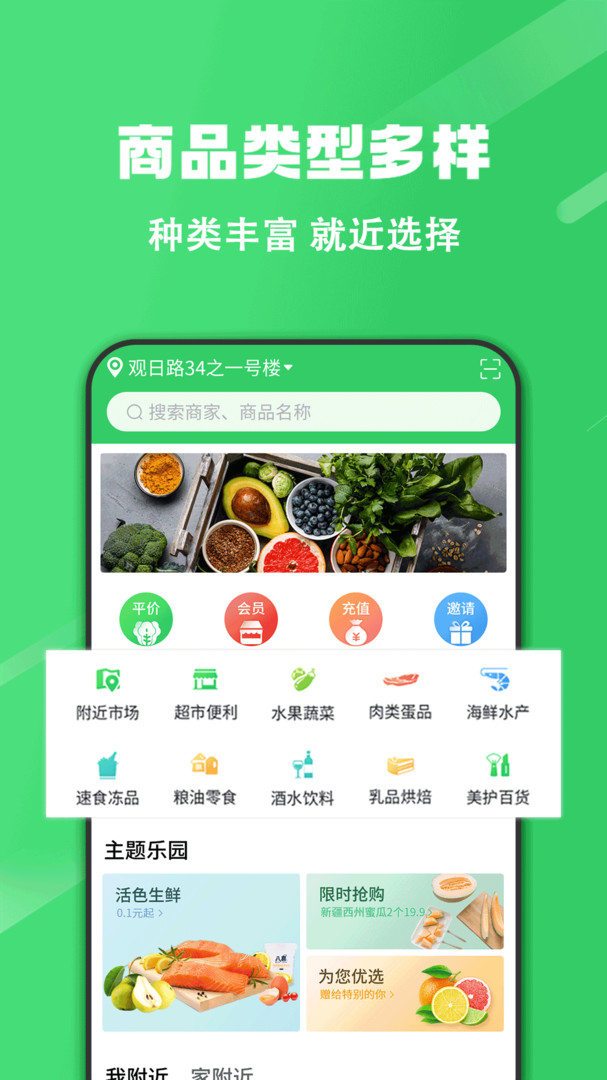 1、打开该软件,在首页有这厨房生鲜,水果,商店超市等商品分类,用户可以根据想要买的商品领取优惠券,下单立即省钱;
