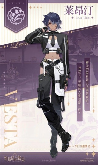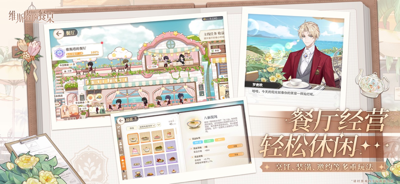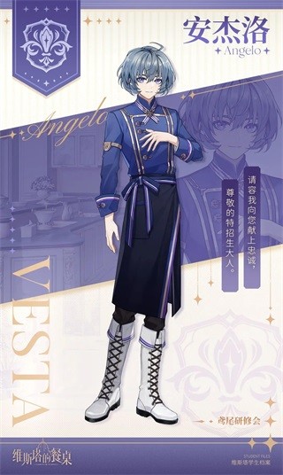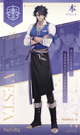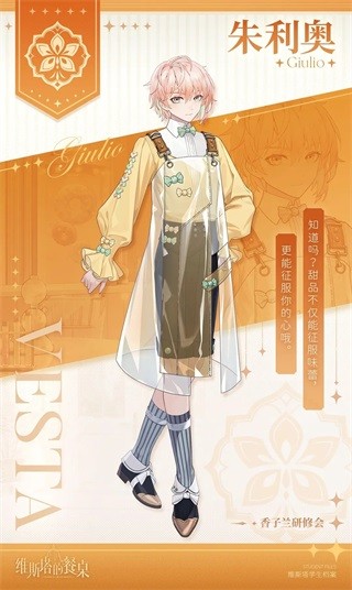 《 维斯塔的餐桌》是一款二次元女性向帅哥厨师养成游戏。在这款游戏中,玩家将扮演一位梦想着拥有一家餐厅的普通女孩,某天你收到了一封维斯塔学院的录取通知书,命运的齿轮就此转动。维斯塔学院是一所知名的烹饪学院,在这里,你将邂逅到不同性格、不同烹饪能力、擅长烹饪不同类型的各类烹饪系男子。你要做的就是招揽他们,与他们一起经营自己的餐厅,不断研究新的菜谱和精进技术,让餐厅更加火热和知名。