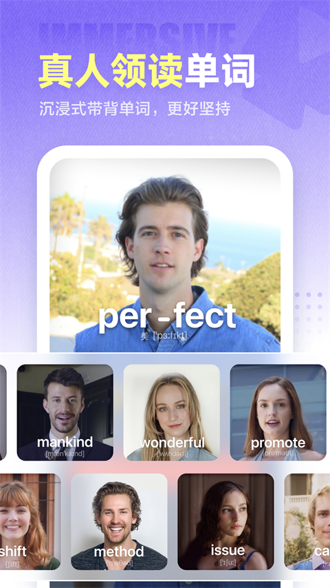 1、好莱坞演员3遍口型领读单词,反复大声朗读,读准每个单词发音