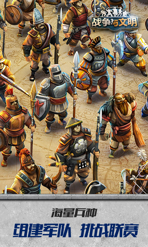战争与文明是一款自由度极高的模拟经营战斗策略游戏,在游戏中凭借其鲜艳亮丽的游戏画风,极富趣味性的游戏玩法,深受玩家们的喜爱,游戏含有丰富的游戏兵种,不论是气势磅礴的骑兵,征战四方的步兵,还有爆发输出的弓箭手,玩家都可对于三大种类的兵种进行自由搭配,灵活克制。感兴趣的快来下载吧!