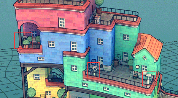 晾衣绳会在间隔1或者2个空间间隙的2层及以上建筑物之间生成,建筑物需满足上一层建筑基块与下一层的颜色相同,同时相对墙壁之间的角度小于 80º且没有门遮挡。