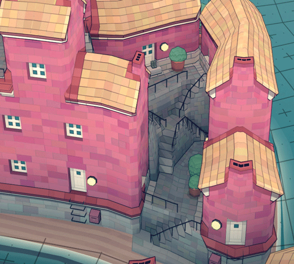 最后一个就是楼梯了,如果两个建筑之间距离一格,会形成一个小型楼梯(如右边的房子)如果距离两格,将会形成一个较大的楼梯(如图左侧所示)